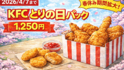 ケンタッキーの人気企画「とりの日パック」が、春休み特別企画として期間拡大されています。通常は毎月28日限定の販売ですが、今回は特別に長期間販売が実施されています。この記事では✔ セット内容✔ 価格✔ 販売期間✔ 注意点をわかりやすく解説しま...