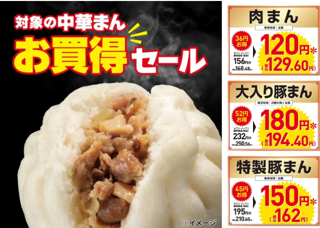 セブン‐イレブンは、2025年11月18日(火)〜21日(金)の4日間、人気の「肉まん」「豚まん」など対象の中華まんが 最大52円引き になる期間限定セールを全国で実施します。