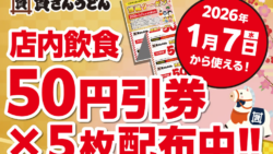 資さんうどんで店内飲食が50円引き!2026年1月7日から使える「資福クーポン」5連配布中。配布期間・対象店舗・使い方・注意点を分かりやすく解説。