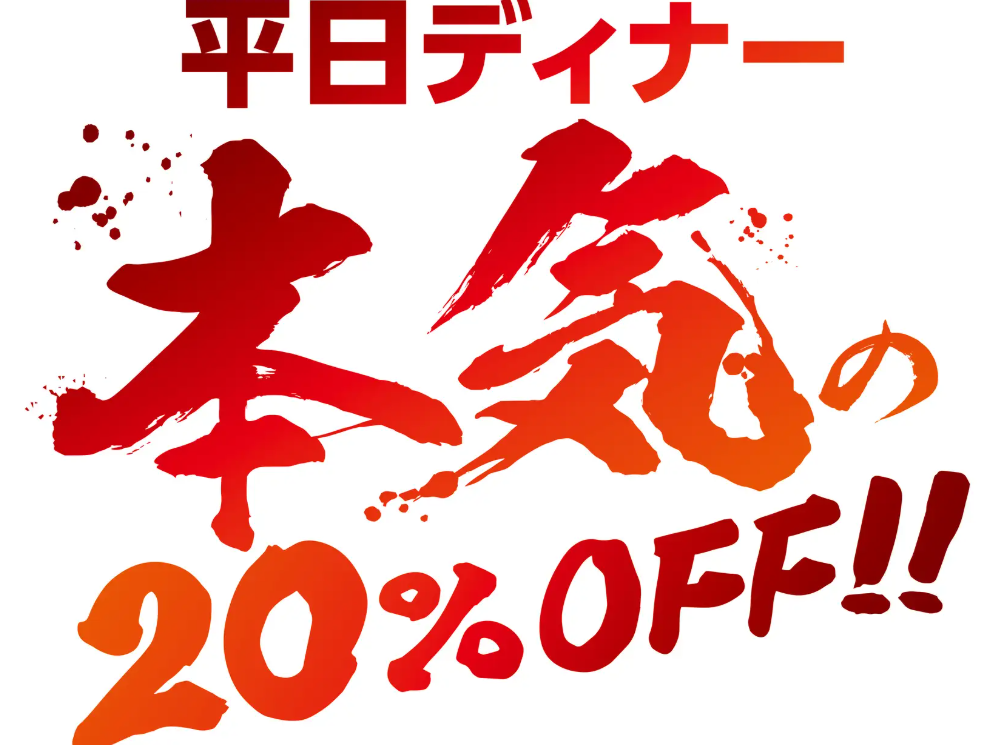 期間中のディナータイム(16時以降)に来店したお客様は、店内全メニューが20%OFF!