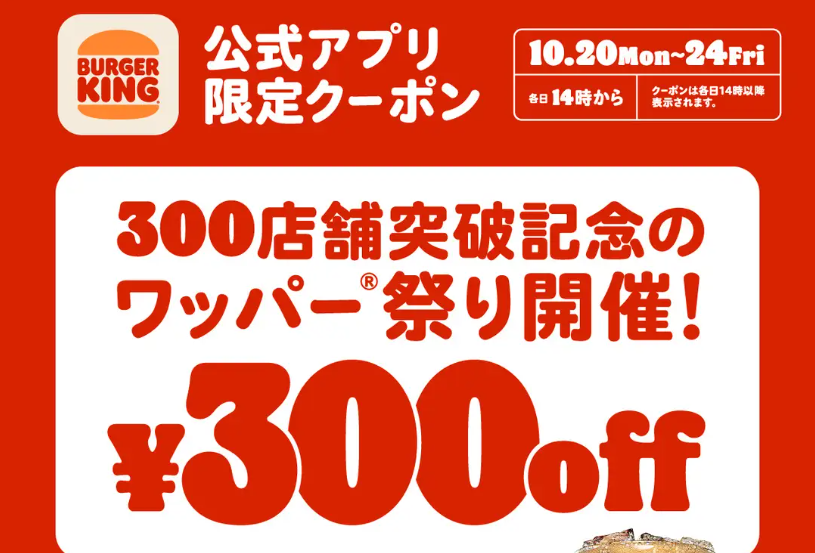 2025年10月20日(月)~10月24日(金)の5日間限定で、各日14時からアプリ限定で使える「ワッパー®祭り」クーポンが登場します。