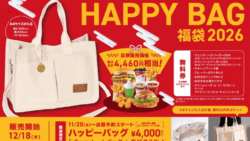 ウェンディーズ 【ウェンディーズ×ファーストキッチン】2026年福袋「ハッピーバッグ」登場!限定2Wayトート&最大4,460円分無料券つき🎁 ウェンディーズ・ファーストキッチンから「ハッピーバッグ2026」が登場!オリジナル2Wayトートバッグに、最大4,460円相当の商品無料券9枚付き。11月20日(木)より店頭予約開始、数量限定販売。 2025.11.13 ウェンディーズ