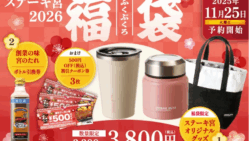 ステーキ宮 【ステーキ宮】創業50周年記念!紅白タンブラー&牛柄バッグ付き「2026福袋」登場! 創業50周年記念!ステーキ宮の2026福袋が登場。紅白タンブラー&牛柄バッグ、宮のたれ引換券、1,500円分クーポン付きで3,800円!11月25日より予約開始。 2025.11.12 ステーキ宮