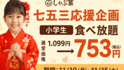 しゃぶ葉 しゃぶ葉 七五三応援企画|小学生食べ放題が753円に!【11/10~11/15限定】 しゃぶ葉の七五三応援企画!小学生の食べ放題が通常1,099円→753円に。11/10~11/15限定、大人1名につき子ども2名まで。未就学児はいつでも無料。公式アプリクーポン提示で簡単利用! 2025.11.11 しゃぶ葉キャンペーン