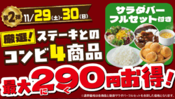 キャンペーン ステーキガスト「肉の日フェア」第2弾まとめ【11/29(土)・30(日)】 ステーキガスト「肉の日フェア」第2弾が11/29・30に開催。厳選ステーキ2種の豪華コンビ4商品が最大290円引きに。全品サラダバーフルセット付きで満足度抜群。内容や注意点を詳しく解説。 2025.11.27 キャンペーンステーキガスト