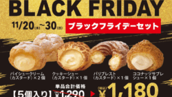 ビアードパパが11/20〜11/30の11日間限定で“ブラックフライデーセット”を販売!人気のパイシューやクッキーシュー、パリブレスト、ココナッツサブレシューが入った5個セットを特別価格で提供。アプリ会員はさらにお得に購入できる期間限定キャンペーンを詳しく紹介。