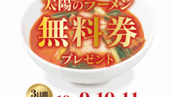 キャンペーン 年に一度の“トマト祭”!太陽のトマト麺がラーメン無料券をプレゼント【10月9日~11日限定】 年に一度の“トマト祭”!太陽のトマト麺が10月9日~11日の3日間限定でラーメン1杯注文につき「太陽のラーメン無料券」をプレゼント。対象は全国の太陽のトマト麺全店、無料券の利用期限は11月30日まで。 2025.10.06 キャンペーン太陽のトマトラーメン未分類