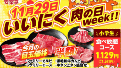 キャンペーン 【安楽亭】いい肉の日は“焼肉フィーバー”!小学生食べ放題1,129円&人気メニュー半額!11/26〜12/2「肉の日 week!!」まとめ【2025】