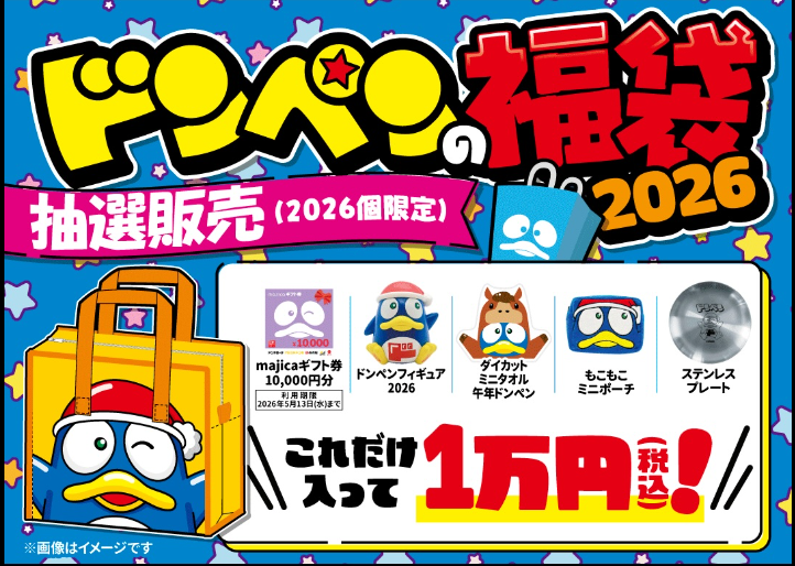 Xユーザーの驚安の殿堂 ドン・キホーテ🐧さん: 「\🎍「ドンペンの福袋2026」🎍/ 本日12/2(火)から抽選販売受付スタート✨ 2026個限定!価格は10,000円(税込)! スペシャルな中身はコチラ! 🌟特製ドンペングッズ 🌟限定ドンペンフィギュア 2026年ver. 🌟majicaギフト券10,000円分(←お得すぎ!?) 今年最後の運試し!応募するしかない!🐧🐎💨 https://t.co/XDTxCT6QyX」 / X