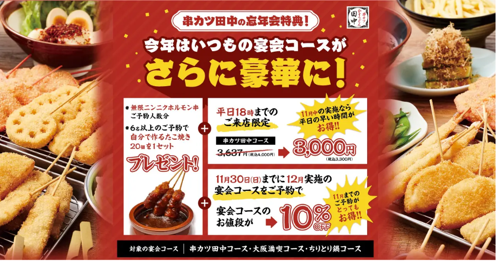【忘年会は11月中の予約がおススメ】幹事さん必見!串カツ田中の忘年会は豪華“早割”特典付き!ご予約はお早めに! | 株式会社串カツ田中のプレスリリース