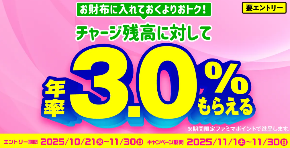 株式会社ファミリーマートは2025年11月1日(土)より、「ファミペイチャージ残高」に対して年率3.0%相当の期間限定ファミマポイントがもらえるキャンペーンを実施します。