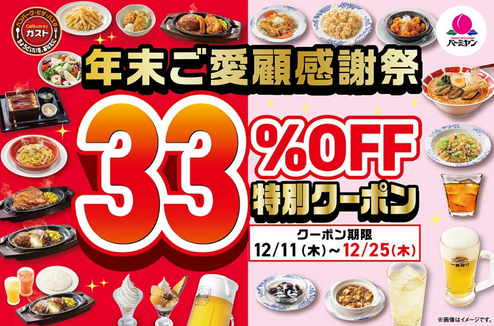 ガストとバーミヤンで2025年12月11日(木)から「年末ご愛顧感謝祭クーポン」キャンペーンがスタート!