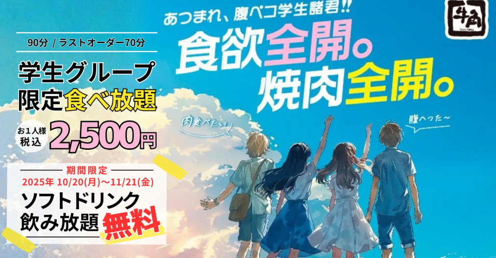 牛角が、学生グループ限定の「2,500円食べ放題コース」に“ソフトドリンク飲み放題無料”の特典を追加。
