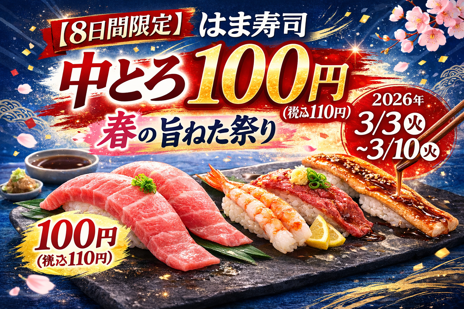 「はま寿司の中とろ100円と春の旨ねた祭り」が開催されます。