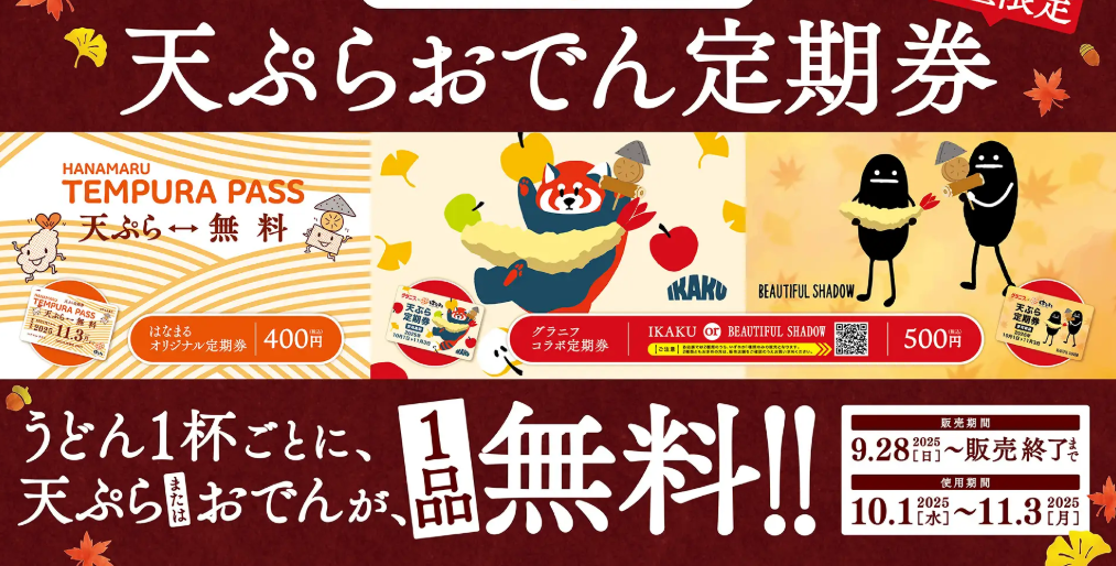【はなまるうどん】天ぷら・おでん定期券2025秋!グラニフコラボ定期券も新登場|最大34日間毎日お得に使える