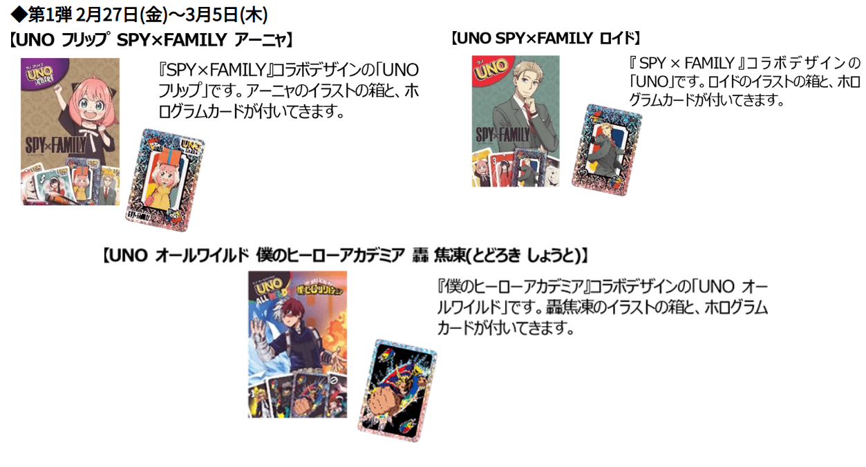 「みんなでUNO」は、人気アニメ『SPY×FAMILY』『僕のヒーローアカデミア』コラボの特別仕様UNOです。