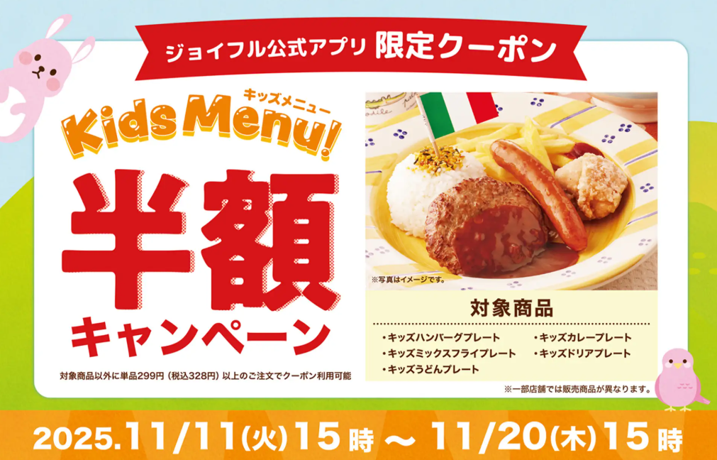 2025年11月11日(火)15時スタート!ジョイフルの「子育て世帯全力応援企画」「キッズ半額キャンペーン」開催! | 株式会社ジョイフルのプレスリリース
