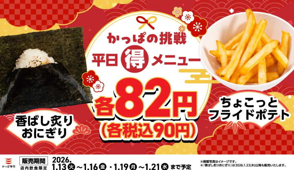 皆さまの熱いリクエストにお応えして、2026年も物価高の平日ごはんの強い味方として、かっぱ寿司は挑戦を続けます!1月13日(火)~平日限定、人気の「おにぎり」「フライドポテト」を税込各90円でご提供! | カッパ・クリエイト株式会社のプレスリリース