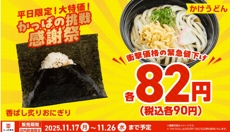 2025年11月17日(月)より、かっぱ寿司が実施する「かっぱの挑戦 感謝祭」では、平日限定で「香ばし炙りおにぎり」と「かけうどん」を**各82円(税込90円)**で提供します!物価高の中で、家族や友人との外食にぴったりのお得なキャンペーン。ランチやディナーに、ぜひチェックしてみてください。