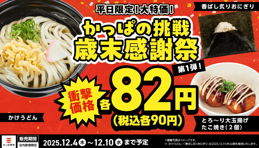 2025年12月4日(木)~12月10日(水)までの平日限定で、 大玉たこ焼き・香ばし炙りおにぎり・かけうどんが各82円(税込90円) という衝撃キャンペーンを実施します。