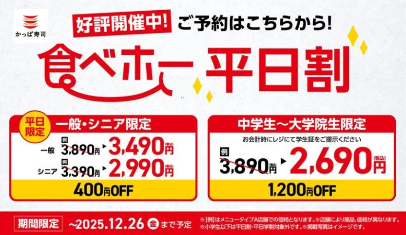 かっぱ寿司の大人気食べ放題「かっぱの食べホー」が、2025年12月26日(金)まで延長決定!