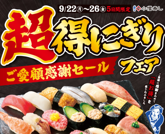 2025年9月22日(月)~期間限定!『【超】得にぎりフェア』開催!(店舗により未実施の場合がございます) | 小僧寿し