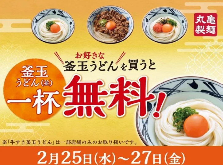 2026年2月25日(水)~2月27日(金)の3日間限定で、対象の釜玉系うどんを購入すると、釜玉うどん並サイズが1杯無料でもらえます。