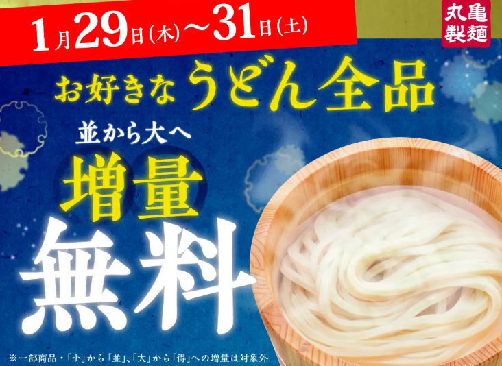 2026年1月29日(木)から1月31日(土)までの3日間限定で、全国の丸亀製麺にて、全うどん商品が終日「並」サイズから「大」サイズへ無料で麺増量されるキャンペーンが実施されます。