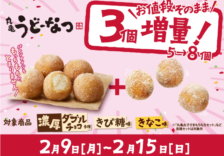 2026年2月9日(月)から2月15日(日)までの1週間限定で、通常5個入りの「丸亀うどーなつ」が8個入りに増量。さらに、対象商品を購入すると、**「ベリーベリーディップソース」**が無料でもらえます。