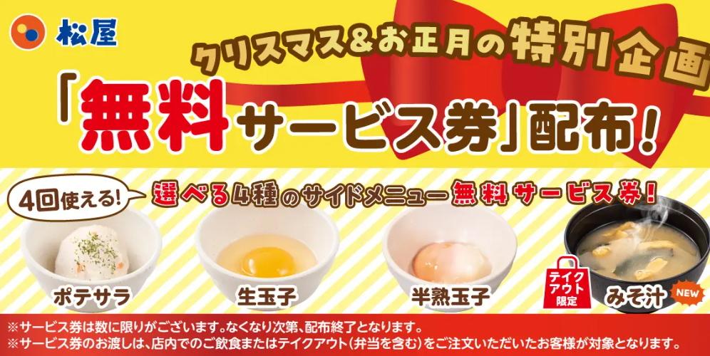 【松屋】年末年始も松屋へ!「選べる4種のサイドメニュー無料サービス券」配布|クリスマス&お正月の特別企画を徹底解説