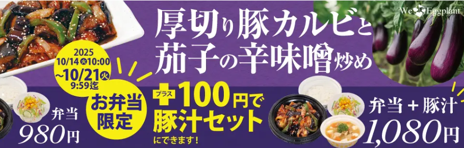 - キャンペーン内容:「厚切り豚カルビと茄子の辛味噌炒め」のテイクアウト注文で、具だくさん豚汁が100円(または130円)で購入可能