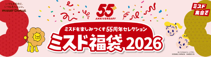 ミスタードーナツを運営する株式会社ダスキンは、創業55周年を記念した『ミスド福袋2026』を 12月26日(金)より数量限定で順次発売します。