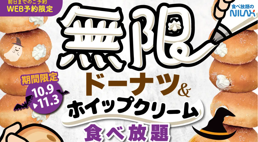 ニラックス株式会社が運営する全国のブッフェレストラン38店舗にて、2025年10月9日(木)~11月3日(月)の期間限定で「無限ドーナツ&ホイップクリーム食べ放題」企画が開催されます。WEB予約限定の特別コースで、甘党にはたまらない夢のような内容です!