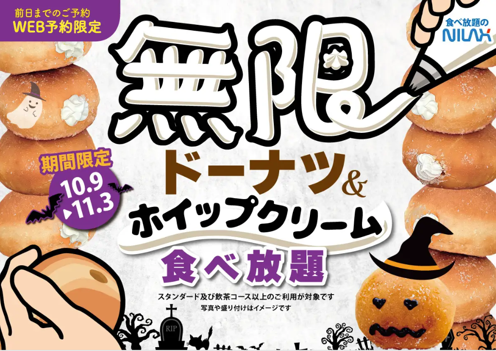 ニラックスブッフェの「無限ドーナツ&ホイップクリーム食べ放題」は、WEB予約限定で11月3日まで楽しめる特別企画。甘党の方はもちろん、ハロウィン気分を楽しみたい方にもおすすめです。家族や友人と一緒に、オリジナルのアレンジドーナツを作って盛り上がりましょう