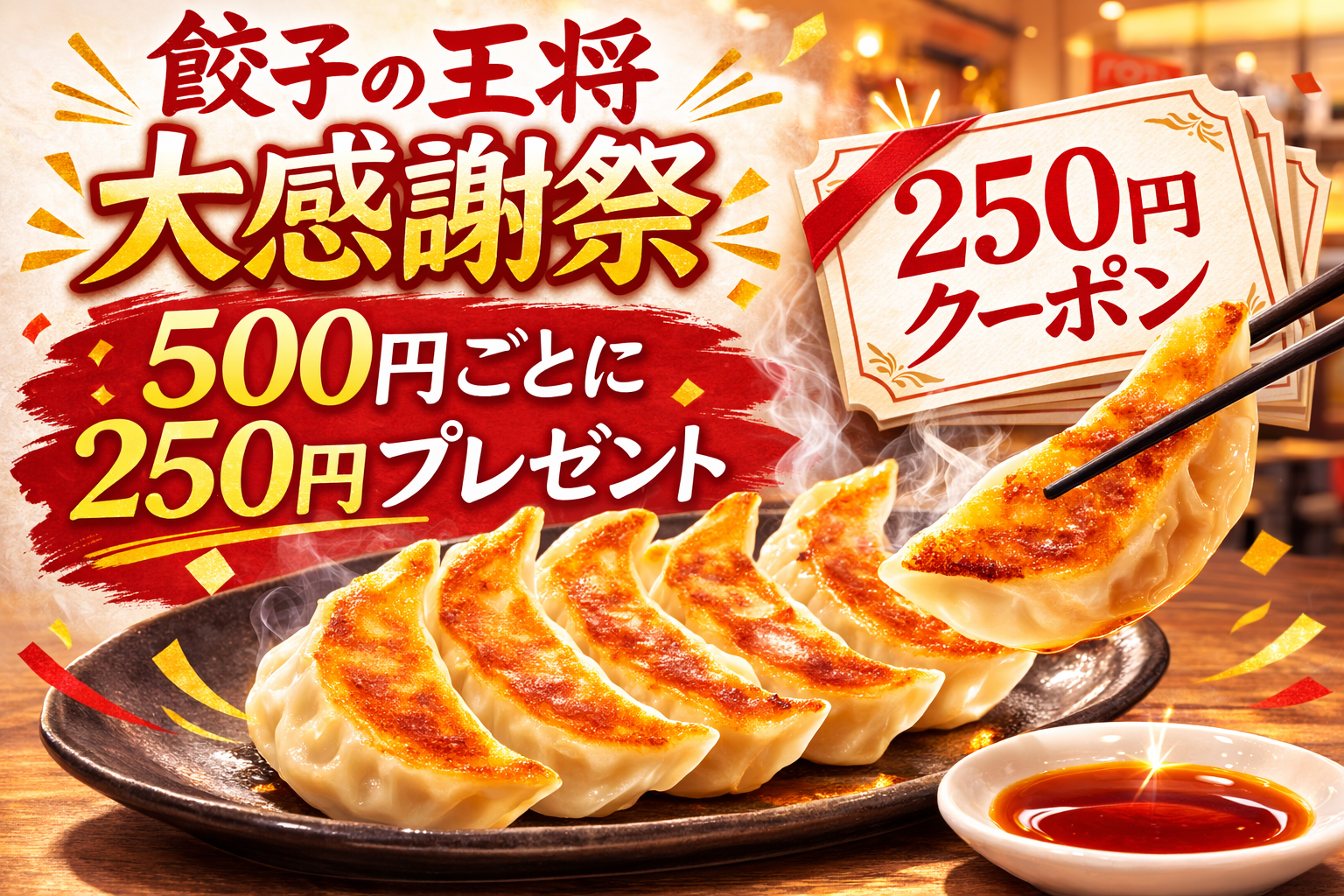【2026年3月】餃子の王将大感謝祭開催!3/5・3/6は500円ごとに250円割引券プレゼント