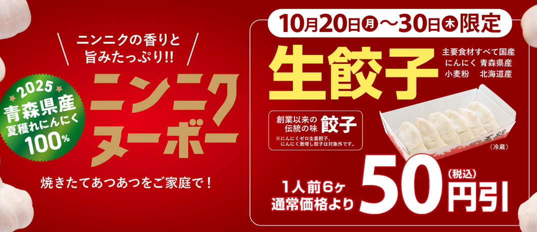 2025年10月20日(月)から10月30日(木)までの期間限定で、「生餃子」が通常価格より50円引きで販売されます!