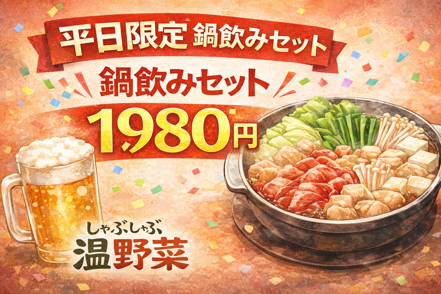 【2026年4月】しゃぶしゃぶ温野菜 鍋飲みセット1980円|平日限定!2時間飲み放題+選べる鍋まとめ