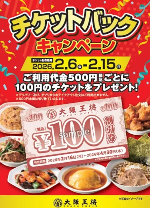 大阪王将チケットバックキャンペーンが2/6からスタート!\500毎に\100チケットをプレゼント | 株式会社イートアンドホールディングスのプレスリリース