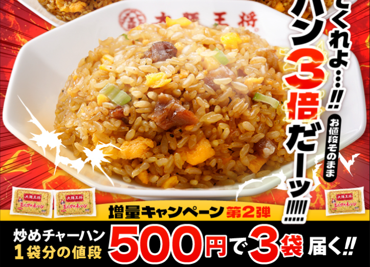 【PR】冷凍中華で人気の「大阪王将公式通販」にて、ただいま直火炒めチャーハンの3倍増量キャンペーンが開催中です!