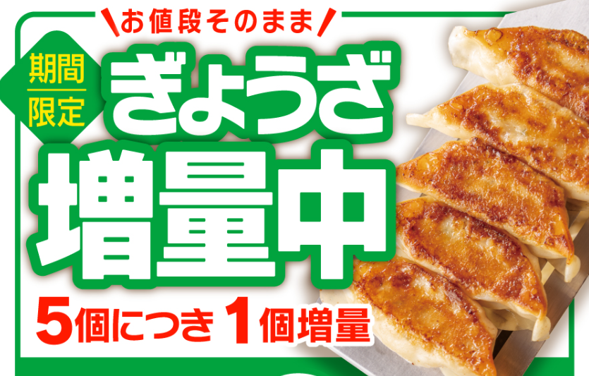 2025年10月の1か月間、リンガーハットの「ぎょうざ」が5個につき1個増量されるキャンペーンが開催中です。