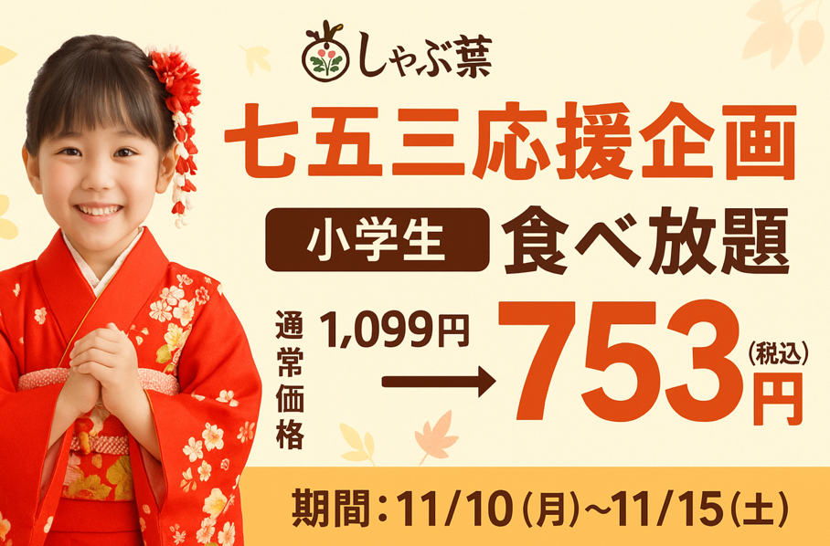 しゃぶ葉では、七五三を迎えるお子さまを応援する特別企画として、**小学生の食べ放題が通常1,099円(税込)→753円(税込)**で楽しめるキャンペーンを実施します。家族での外食にぴったりの期間限定サービスです。(画像はイメージです)