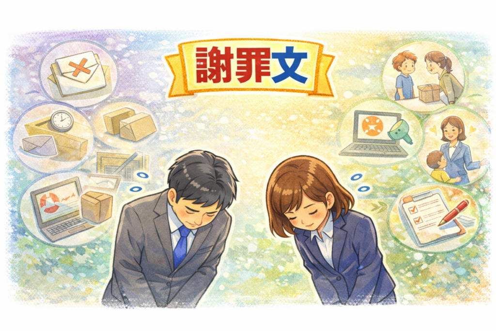 「何を書けばいいのかわからない」「失礼にならない表現を知りたい」「すぐ使える例文がほしい」――そんなときに役立つ、幅広いケース別の謝罪文テンプレートを網羅しました。