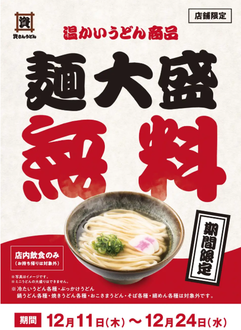 | 内容 | 温うどん大盛無料(通常1玉 → 大盛1.5玉) |