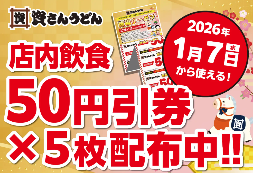 【お得なクーポン配布中!】今年一年の皆さまへの「感謝」の気持ちを込めて、来年1月7日~資さんうどんで使える「店内飲食50円引」5連クーポンを配布中!(一部店舗除く)新年の「資始め」にご利用ください!! | 株式会社資さんのプレスリリース