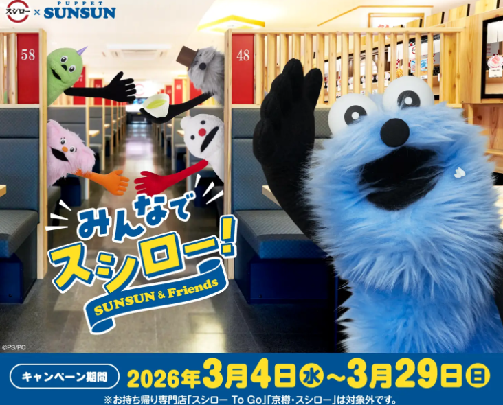あきんどスシローと、人気キャラクターパペットスンスンのコラボ第2弾が2026年3月4日(水)より全国のスシロー店舗でスタートします。