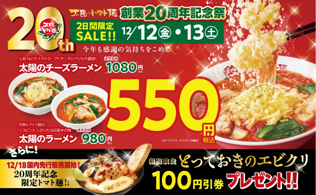 トマトラーメン専門店「太陽のトマト麺」が、2025年12月で創業20周年を迎えます!