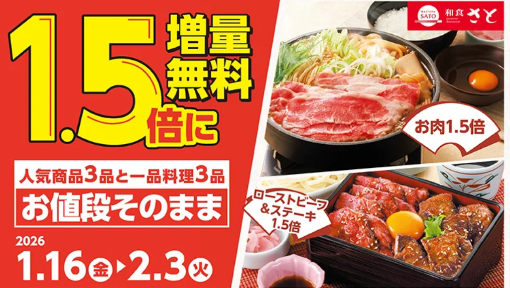 本キャンペーンは、和食さとのグランドメニューで販売中の商品と比較して、対象メニューを無料で1.5倍に増量して提供するものです。