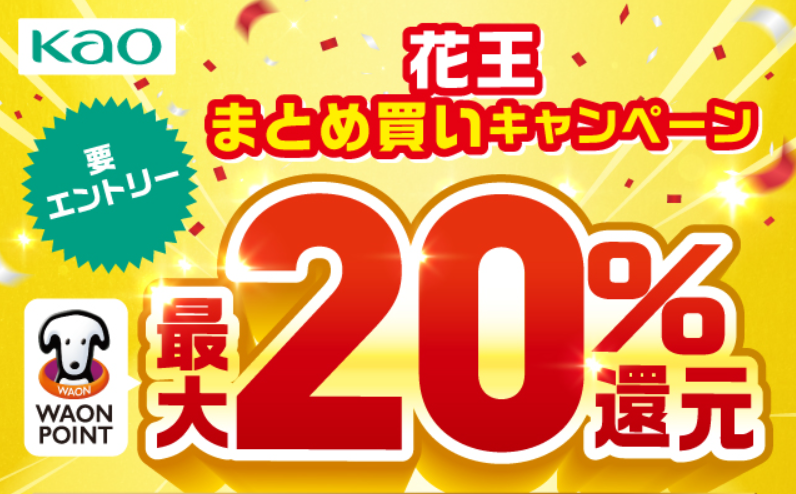 - キャンペーン名:花王まとめ買いキャンペーン(WAON POINT最大20%還元)