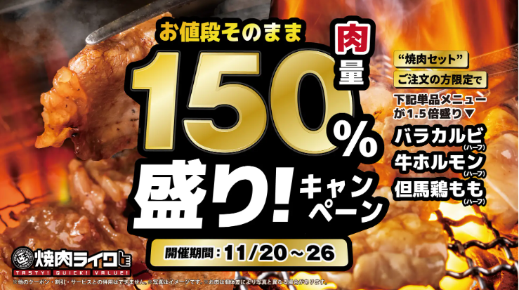 2025年11月20日(木)~26日(水)の期間限定で、“お値段そのまま”でお肉が150%盛りになるお得なキャンペーンを開催します。