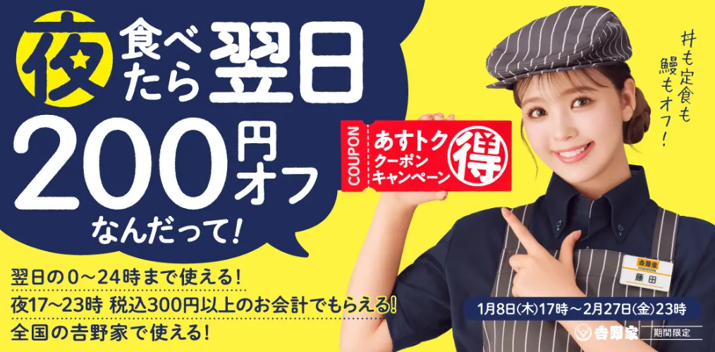 「あすトククーポンキャンペーン」は、夜に吉野家で食事をすると、翌日の食事代が200円引きになるレシートクーポンがもらえるキャンペーンです。